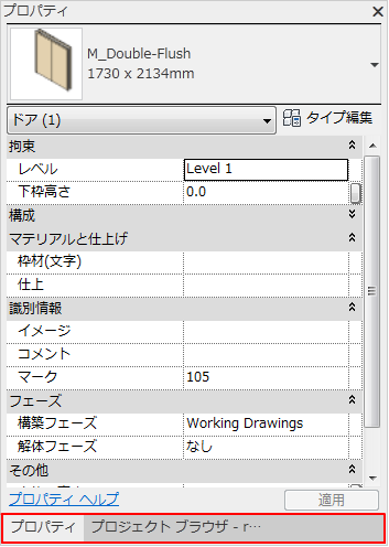 次の図では、[プロジェクト ブラウザ]と[プロパティ]パレットがグループ化されています。[プロパティ]パレットがアクティブなタブであることに注意してください。