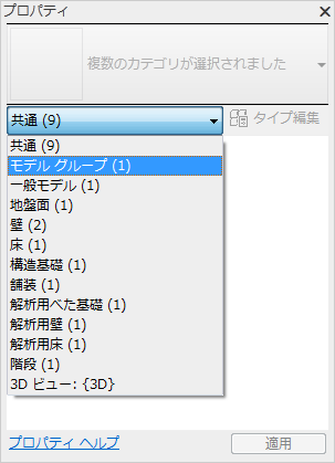 タイプ セレクタのすぐ下にあるのは、ツールにより配置される要素のカテゴリ、または作図領域で選択された要素のカテゴリと数を識別するフィルタです。複数のカテゴリまたはタイプが選択されている場合、すべてに共通のインスタンス プロパティのみパレットに表示されます。複数のカテゴリが選択されている場合、フィルタのドロップダウンを使用して、特定のカテゴリまたはビュー自体のプロパティのみ表示します。特定のカテゴリを選択しても、選択セット全体には影響を与えません。