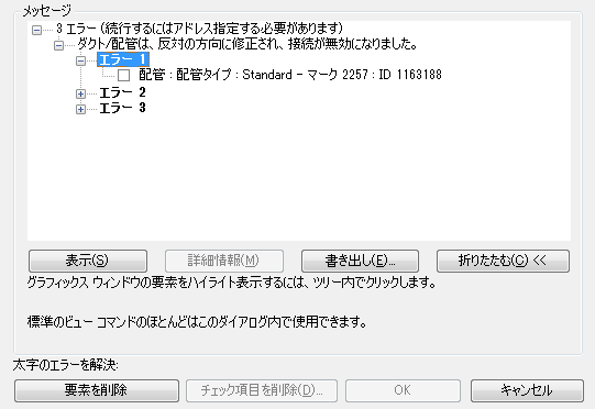 エラー ダイアログで、[展開]をクリックすると、最後の操作に関連するエラーと警告のリストがツリー構造で表示されます。