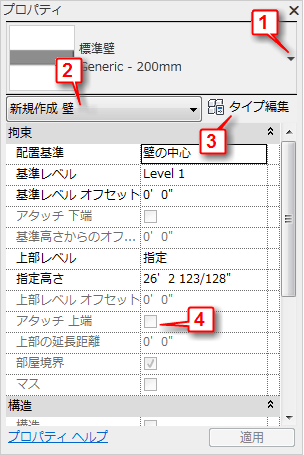 ほとんどの場合(例外については次の注記を参照)、プロパティ パレットにはユーザが編集可能なインスタンス パレットと読み取り専用(シェード)のインスタンス プロパティの両方が表示されます。プロパティは、その値がソフトウェアにより自動的に計算または割り当てられることにより、または別のプロパティの設定の影響により、読み取り専用になる場合があります。たとえば、壁の[高さ指定]プロパティは、壁の[上部の拘束]プロパティの値が[指定]の場合のみ編集可能です。具体的な依存関係については、個別の要素タイプのインスタンス プロパティの説明を参照してください。