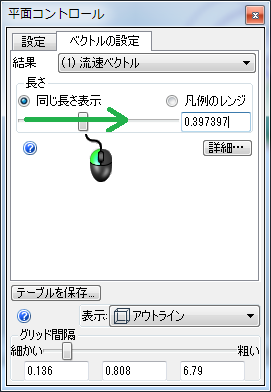5. [平面コントロール]ダイアログの[グリッド間隔]スライダを[細かい]に向けてドラッグします。