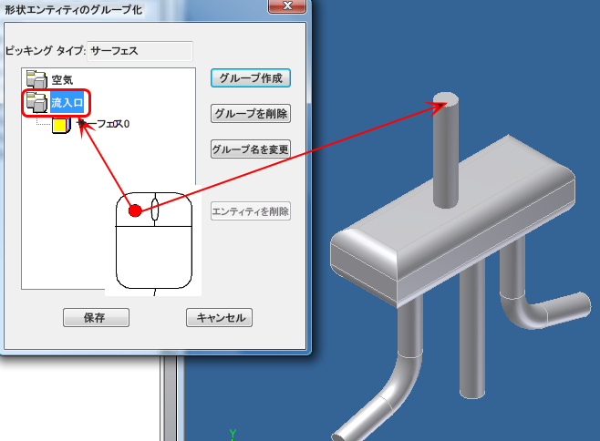 このステップでは、2種類のCADエンティティ グループを作成します。1つは流入口サーフェスを含むものです。もう1つは3つの流出口サーフェスを含むものです。初期のステップで作成したルールは、これらのCADエンティティ グループに追加されたサーフェスを参照します。