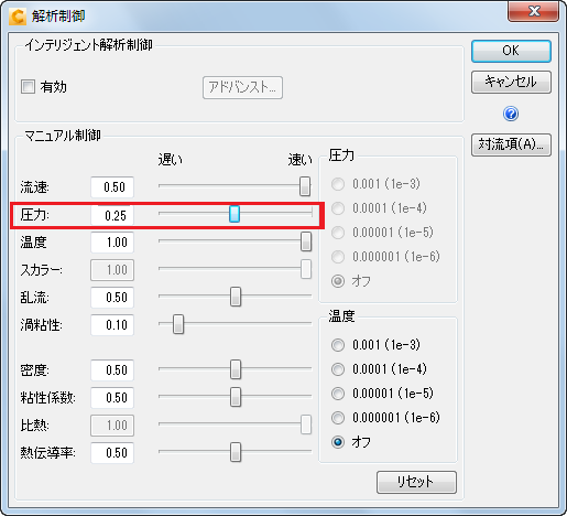 [解析制御]ボタンをクリックし、[圧力]スライダを 0.25 に設定します。