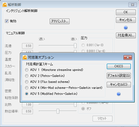 [解析制御] ボタンをクリックします。[解析制御]ダイアログ ボックスで、[対流項]をクリックします。[対流項オプション]ダイアログ ボックスで、[ADV 5]を選択します。両方のダイアログを閉じます。