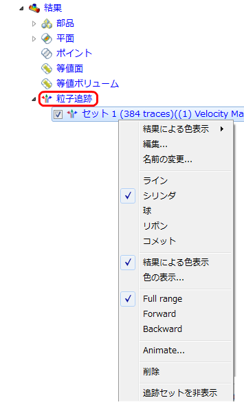 粒子追跡ブランチで、外部ファイルに粒子追跡データを保存することができます。新しい粒子追跡を作成するには、[粒子追跡]状況依存リボン メニューの[追加]コマンドを使用します。