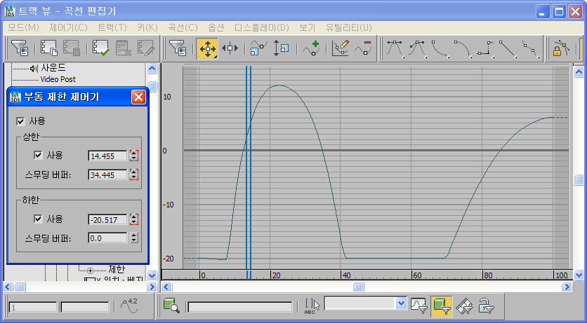 키프레임 및 기타 표준 방법을 통해 스무딩 버퍼 값을 애니메이션하고 제어기의 제한 분기에서 하한 스무딩 트랙을 통해 트랙 뷰에서 이 애니메이션을 조작할 수 있습니다.