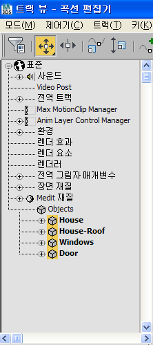 트랙 뷰는 애니메이션 트랙을 편집을 위한 세련된 방법을 제공합니다. 또한 이 뷰의 계층 리스트는 배경의 모든 오브젝트를 이름별 그리고 계층별로 보여줍니다. 트랙 뷰를 이용하여 계층 리스트에서 오브젝트 아이콘을 클릭함으로써 배경의 오브젝트를 선택할 수 있습니다.