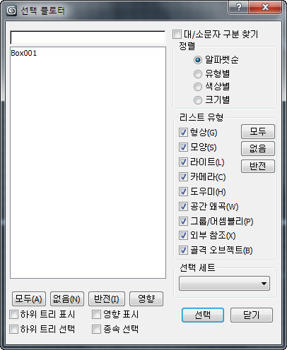 이 모달리스 대화상자는 배경의 오브젝트를 선택할 수 있게 합니다. 장면에서 작업하는 동안 이 대화상자를 그대로 둘 수 있으며 이는 오브젝트 선택을 쉽게 해줍니다.