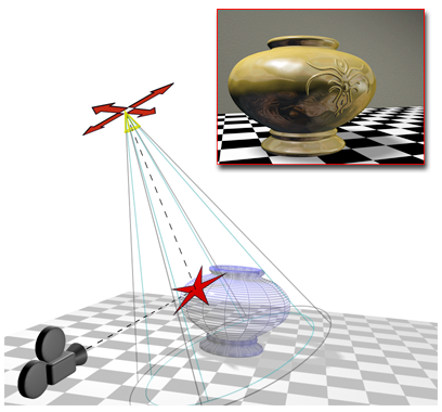 강조 표시 배치 모드에서 마우스를 클릭하여 뷰포트 주위로 드래그할 수 있습니다. 강조 표시 배치는 뷰포트에 따른 기능이므로 렌더링할 뷰포트를 사용합니다. 장면에서 마우스를 드래그함에 따라 마우스 커서에서 장면 내로 광선이 발사됩니다. 표면에 닿으면 표면의 해당 지점에서 표면 법선을 볼 수 있습니다.