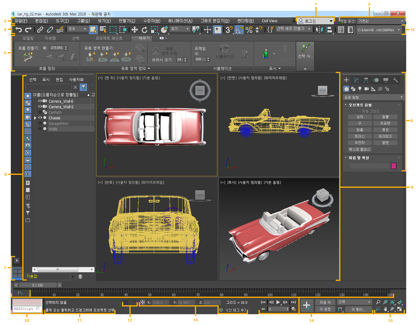 3ds Max 인터페이스는 컨트롤, 상태 정보 및 장면을 보고 작업하는 뷰포트로 구성됩니다.