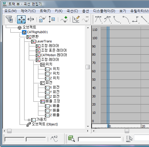 작업 공간을 간소화하기 위해 CAT에는 기본적으로 활성 레이어의 제어기 및 키프레임만 표시됩니다. 레이어에서 작업할 때는 활성 레이어의 키프레임만 표시되면 수행 중인 작업을 쉽게 파악할 수 있습니다.