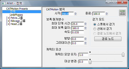 전역 패널에는 현재 CATMotion 레이어의 마스터 설정이 포함됩니다.