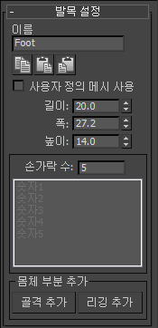 손바닥 매개변수에는 손가락 추가 또는 제거를 위한 리스트 상자 및 치수가 포함됩니다. 발목 설정 롤아웃도 동일합니다.