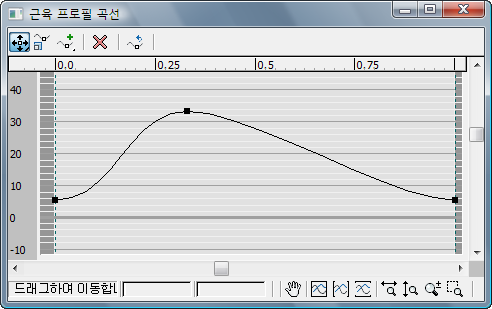 - 편집하여 근육 가닥의 프로필(윤곽)을 제어할 수 있는 그래프가 포함된 근육 프로필 곡선 대화상자를 엽니다. 기본적으로 근육은 중간이 두껍고 끝은 얇지만, 곡선에서 세 점을 이동하여 이러한 두께를 변경할 수 있습니다. 곡선에 점을 추가할 수는 없습니다.