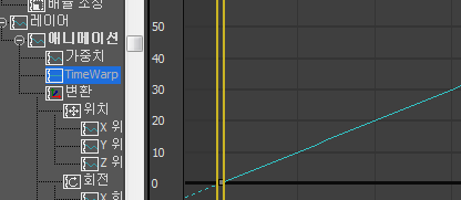 그러면 시간 왜곡 트랙 및 곡선을 애니메이션 레이어 트랙 아래 추가합니다. 기본적으로 시간 왜곡은 선형이므로 아무런 영향이 없지만 트랙 뷰의 곡선과 마찬가지로 이 곡선을 편집하여 시간 왜곡 효과를 수정할 수 있습니다.