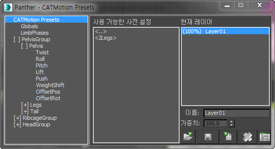 CATMotion 사전 설정은 특정 모션 주기에 대한 모든 CATMotion 제어기의 설정으로 구성됩니다. 이 데이터는 CATMotion 레이어에 포함되며, 이 레이어는 레이어 관리자 롤아웃에 있는 애니메이션 레이어와는 다릅니다. 확장자가 .cmp인 텍스트 파일을 사용하여 개별 레이어를 저장 및 로드할 수 있습니다.