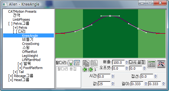 CATMotion에서 대상 변경은 두 제어기(KneeAngle 및 LegWeight)를 통해 제어됩니다.