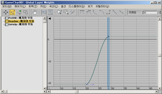 레이어 관리자 롤아웃에서 곡선 편집기에서 전역 레이어 가중치 뷰가 열리고 리그의 기존 레이어가 표시됩니다. 다음 그림에서는 PreHit, Reactor 및 GetsUp의 세 레이어를 보여 줍니다.