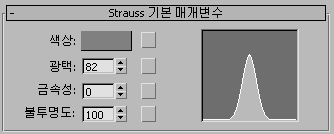 재질의 색상을 제어합니다. 이 옵션은 다른 종류의 셰이더에 대해 지정한 분산 색상에 해당합니다. 스트라우스 셰이더를 사용하는 경우 이 색상만 제어합니다. 셰이더는 주변 및 반사광 색상 구성요소를 계산합니다.