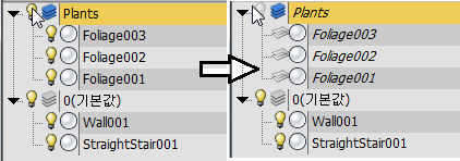 장면 탐색기에서 선택 도구 모음의 버튼을 사용하여 두 개의 서로 다른 정렬 모드 간에 전환할 수 있습니다.