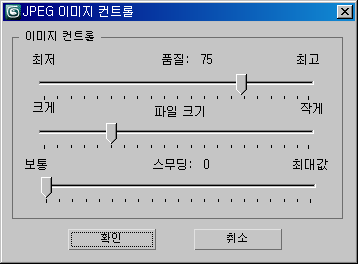 JPEG이 지정 출력 형식인 경우, 출력 파일 렌더링 대화상자에서 렌더 또는 설정을 클릭하면 JPEG 이미지 콘트롤 대화상자가 나타납니다.