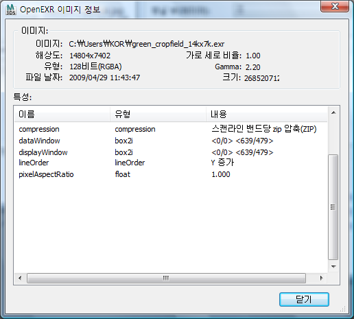 - EXR 파일에 대한 정보를 표시하는 읽기 전용 대화상자를 표시하려면 클릭합니다. 정보에는 이미지 특성과 카메라 속성, 해상도 등과 같이 파일에 저장되어 있을 수 있는 메타데이터가 포함됩니다.