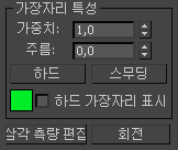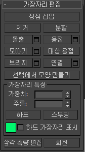 가장자리 하위 오브젝트 수준에서 단일 및 다중 가장자리를 선택하고 표준 방법을 사용하여 변환할 수 있습니다. 이 항목에서는 형상 편집 및 가장자리 편집 롤아웃을 다루며 다른 컨트롤에 대한 내용은 편집 가능한 폴리를 참조하십시오.