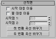 선직면 구성에 사용된 곡선 방향 중 하나를 대칭 이동합니다. 상위 곡선의 방향을 이용하여 선직면이 만들어집니다. 두 상위가 반대 방향일 경우 선직면은 나비 넥타이 모양이 될 수 있습니다. 상태를 바로 잡으려면 해당 상위 곡선의 반대 방향을 이용하여 선직면을 구성하도록 시작 대칭 이동 또는 끝 대칭 이동을 사용합니다. 이 컨트롤은 곡선을 역전시킬 필요를 없애줍니다.