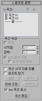 U 로프트 하위 오브젝트를 선택하면 U 로프트 매개변수가 수정 패널 아래쪽에 표시됩니다. 이 롤아웃은 하나의 U 로프트 하위 오브젝트가 선택될 경우에만 표시됩니다. 한 번에 둘 이상의 U 로프트를 편집할 수 없으며 일부 다른 NURBS 하위 오브젝트와 달리 이 롤아웃은 다중 U 로프트 하위 오브젝트를 선택한 경우 표시되지 않습니다.