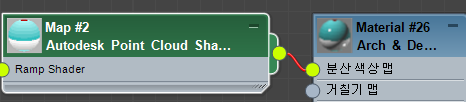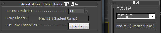 점 구름 오브젝트를 장면에 추가하면 3ds Max가 자동으로 Autodesk 점 구름 재질을 적용합니다. 일반적으로는 이 재질을 조정하지 않아도 되지만 필요한 경우 색상 강도, 주변 폐색 및 그림자 수신에 대한 컨트롤을 제공합니다.