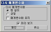CV 곡선 및 표면에 대한 다시 매개변수화 버튼을 클릭하면 이 대화상자가 표시됩니다. CV 하위 오브젝트를 다시 매개변수화하면 해당 매개변수 공간이 변경되어 제어점 위치 및 하위 오브젝트의 모양 간에 보다 나은 관계를 제공합니다.