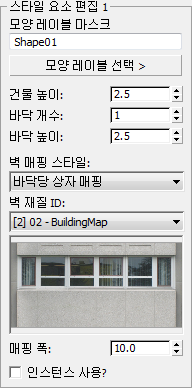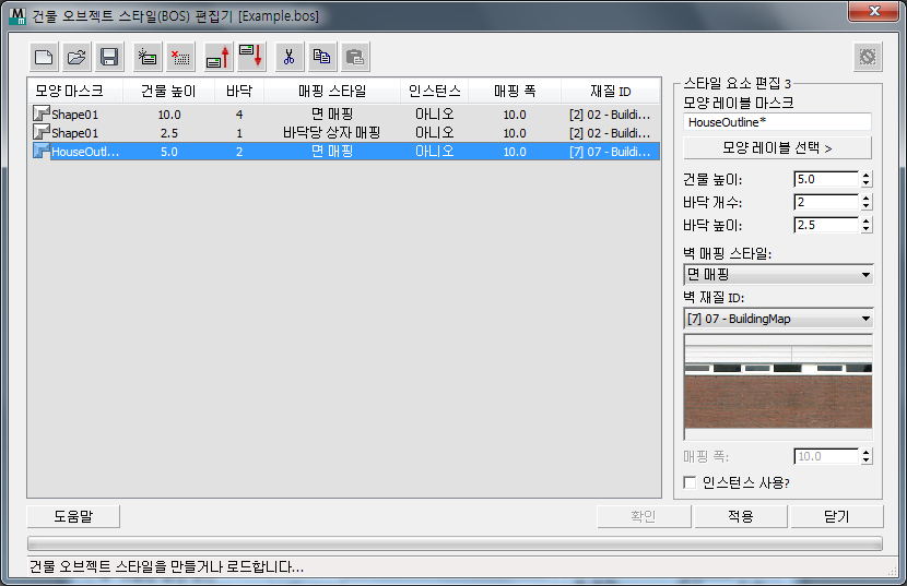 BOS 요소 리스트에서 선택한 건물 스타일의 설정을 표시하며 스타일이 적용되는 모양을 선택할 수 있습니다.
