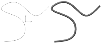 NURBS 곡선에 두께를 지정하여 원형 오브젝트로 렌더링할 수 있습니다. 굵은 곡선은 NURBS 표면이 아닌 폴리곤 메시로 렌더링됩니다.