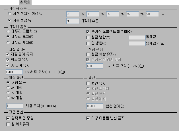 이 옵션을 설정하면 최적화하기 전에 정점 병합 도구가 적용됩니다. 기본적으로 해제되어 있습니다.