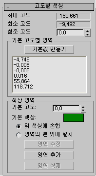 이 그룹 상자의 항목은 높이 영역에 색상을 할당합니다. 예를 들어 파란색 수준을 변경하여 물 깊이를 나타낼 수 있습니다. 색상 영역의 변경 내용은 영역 수정 또는 영역 추가 버튼을 클릭할 때까지 지형 오브젝트에 영향을 주지 않습니다.