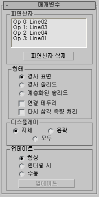 윤곽 데이터를 가져오거나 만들고 오브젝트를 선택한 다음 지형 버튼을 클릭하면 3ds Max는 윤곽 데이터에 기반하여 새 삼각형 메시 오브젝트를 만듭니다. 선택한 첫 번째 스플라인의 이름이 지형 오브젝트의 이름이 됩니다. 선택한 다른 스플라인은 아래에 설명된 피연산자 선택 롤아웃에서 이전에 설정된 참조, 이동, 복사 또는 인스턴스 선택에 따라 처리됩니다.
