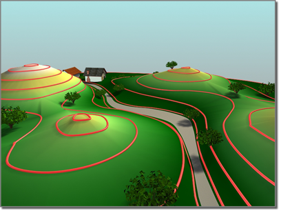 지형을 만들려면 높이 윤곽을 나타내는 편집 가능한 스플라인을 선택한 다음 지형을 클릭합니다. 그러면 3ds Max에서 윤곽에 메시 표면을 생성합니다. 각 윤곽 데이터 수준이 육지 형태의 일반적인 연구 모델과 유사한 스텝이 되도록 지형 오브젝트의 "테라스" 표현을 만들 수도 있습니다.