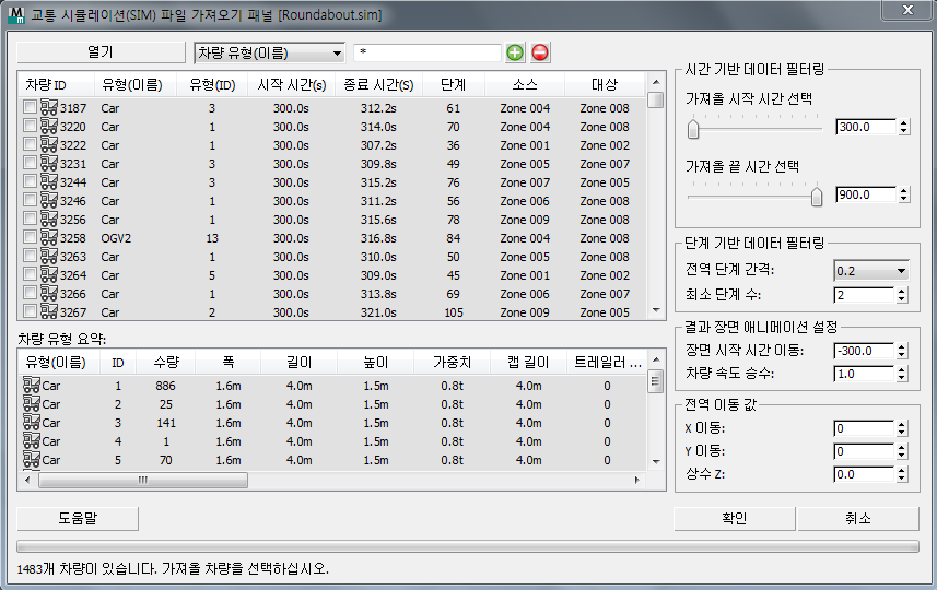 SIM 파일에서 교통 데이터를 가져올 수 있습니다. SIM 파일은 Quadstone Paramics 같은 호환되는 타사 응용 프로그램에서 생성할 수 있습니다.