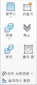 리본의 슬라이스 평면을 사용하면 슬라이스 모드 컨텍스트 패널에서 슬라이스, 분할 및 평면 재설정 컨트롤을 사용할 수 있습니다.