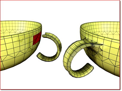 - 원래 두 오브젝트에 할당된 매핑 좌표는 가능한 범위로 유지됩니다. 두 개의 원래 매핑 좌표 세트와 형상 유형 간의 복잡성 및 차이에 따라 브리징된 영역에서 불규칙한 점이 발견될 수 있습니다.