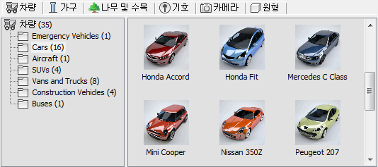 Civil View 오브젝트 라이브러리는 오브젝트 배치 스타일 편집기의 내용에 대한 기본을 구성합니다. 이 패널은 배치된 오브젝트 범주의 오브젝트를 현재 장면에 배치합니다.