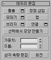 폴리 편집 테두리 하위 수준 오브젝트에서 단일 및 다중 테두리를 선택하고 표준 방법을 사용하여 변환할 수 있습니다. 이 항목에서는 형상 편집 및 테두리 편집 롤아웃에 대해 다루며 다른 컨트롤에 대한 내용은 폴리 편집 수정자를 참조하십시오.