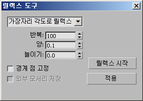 릴렉스 도구 대화상자는 텍스쳐 맵의 왜곡을 제거하거나 최소화하기 위해 선택된 텍스쳐 좌표의 간격을 파라메트릭 방식으로 수정하는 고급 도구 세트를 제공합니다.