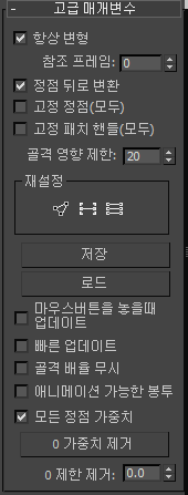 메시, 패치 또는 NURBS 오브젝트 선택 > 수정자 메뉴 > 애니메이션수정자 > 스킨 > 고급 매개변수 롤아웃
