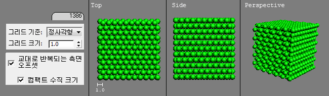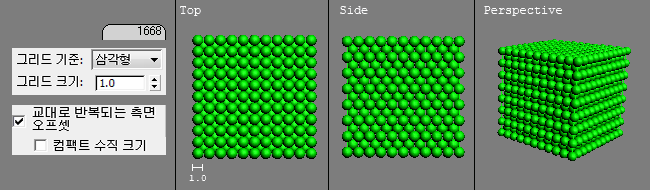 - 단일 그리드 레이어에서 사각형 또는 삼각형 레이아웃으로 파티클을 압축하는 방법을 선택합니다. 두 가지 선택 사항은 다음 그림의 위에서 보이는 대로 표시됩니다.