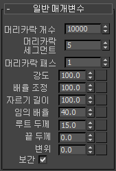 밀도, 배율 조정, 자르기 길이, 임의 배율, 루트 두께, 끝 두께 및 변위와 같은 일반 매개변수 롤아웃의 여러 매개변수에 맵을 적용할 수 있습니다.
