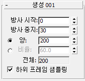 양을 사용할 때 프레임당 방사되는 파티클 수를 지정하려면 양 값을 방사 프레임 수(방사 중지-방사 시작+1)로 나눕니다.
