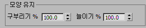 이러한 설정은 구부리기 % 및 늘이기 %의 값을 기준으로 메시 모양을 유지합니다. 일반적인 작업에서는 의상에서 시뮬레이션을 만들 때 의상을 "편평화"하려고 합니다. 이러한 설정을 활성화하려면 대상 상태 사용을 켭니다.