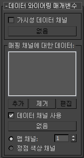 매핑 채널로 데이터 채널을 추가하려면 먼저 데이터 채널 사용 확인란의 없음 버튼을 클릭하여 실수 또는 벡터 유형의 데이터 채널을 선택합니다. 그런 다음 이 데이터 채널이 이동할 매핑 채널(맵 채널(채널 번호도 설정) 또는 정점 색상 채널)을 선택합니다. 마지막으로 추가 버튼을 클릭합니다.