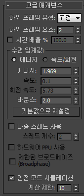 팁: 이동하지 않아야 할 오브젝트가 이동하는 경우와 같이 시뮬레이션에서 불안정 상태가 발생하면 하위 프레임 요소 값을 늘리십시오. 하위 프레임 요소 값을 설정하는 일반적인 규칙은